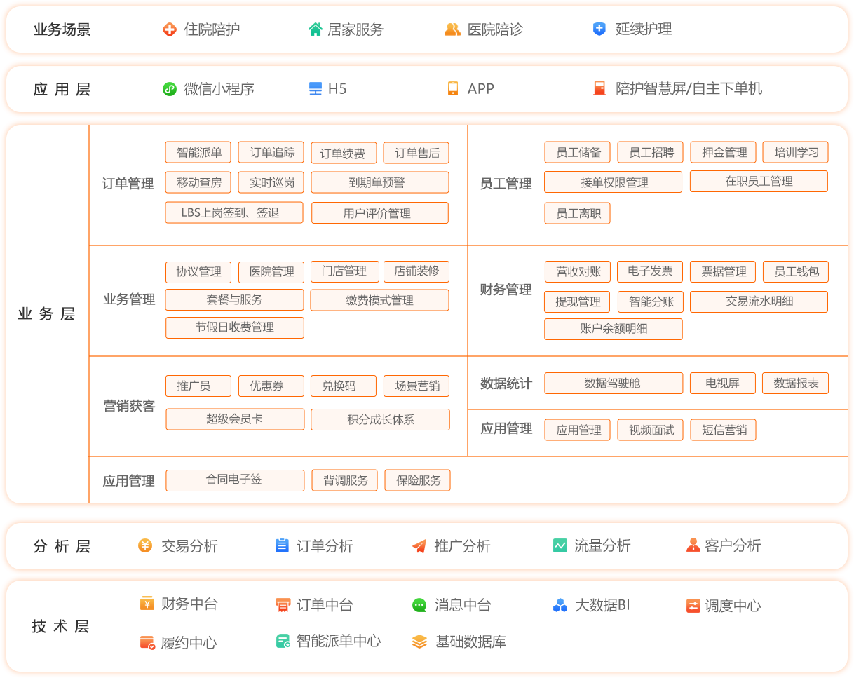 以信息技术为驱动,通过科技创新为智慧行业进行聚合和赋能,打造开放的智慧陪护服务产业生态。为住院陪护、居家服务、医院陪诊、延续护理提供一站式解决方案。